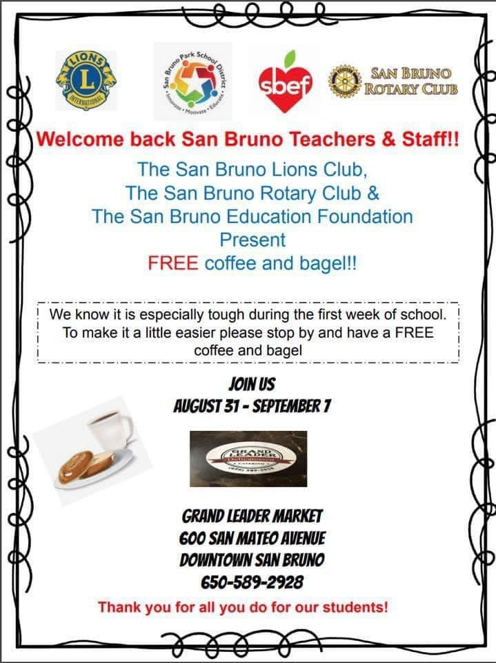 SBEF is excited to partner with the San Bruno Park School District, San Bruno Lions Club and San Bruno Rotary in sponsoring free coffee and bagels for our District’s teachers and staff next week at Grand Leader Market in downtown San Bruno. We know the first week of school can be a challenging transition, but it’s especially challenging now, during …