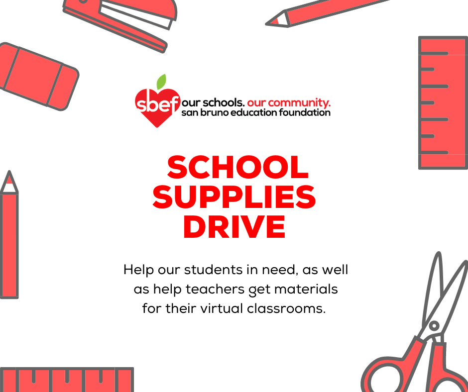 The San Bruno Education Foundation is hosting a school supplies drive! We’re collecting supplies for our District’s students in need, as well as classroom materials for our teachers. In general, we need: PencilsNotebooksCrayonsColored pencilsMarkersErasersScissorsGlueGlue sticksPencil sharpenersDry erase markers & erasers RulersPencil boxes or zipper pencil cases You can find a complete list of supplies needed here. There are three ways to …