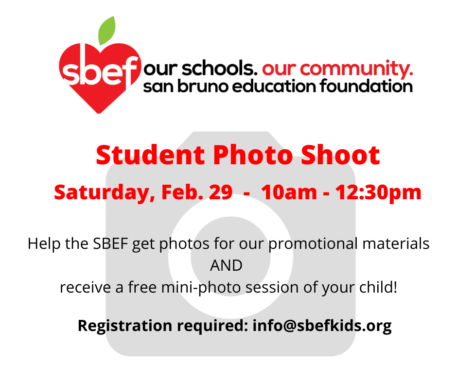 The San Bruno Education Foundation needs high-quality photos of students in San Bruno’s public schools for our promotional materials. Participating students will receive a mini-photo session with a professional photographer and digital photo files. SPACE IS LIMITED. Registration required. Details: Saturday, February 29: 10am – 12:30pm at a San Bruno Elementary School Questions/registration: Email info@sbefkids.org with name, grade and school …