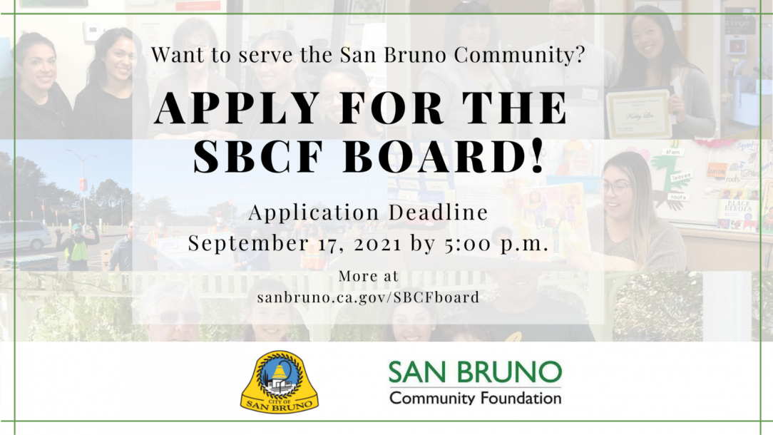 Looking to make an impact in the San Bruno community? The San Bruno Community Foundation is recruiting new members to serve on its Board of Directors. Applications are due by Friday, Sept. 17, at 5 p.m. You can learn more about board member qualifications and responsibilities in this brochure. Complete your application here.